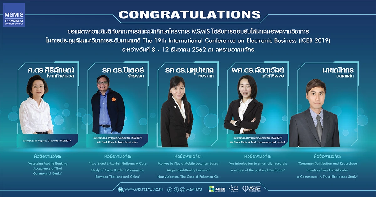 อีกทั้งได้รับเกียรติเป็น International Program Committee ICEB2019 และ Track Chair ใน Track E-commerce and e-retail